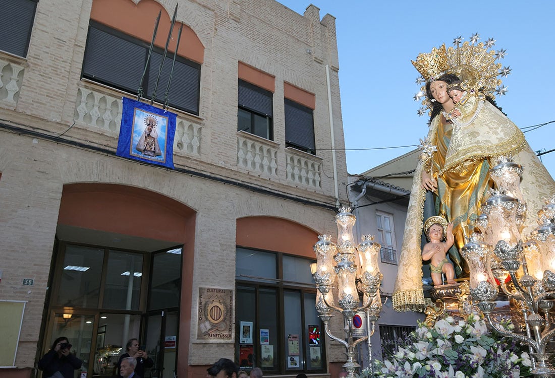 La imagen peregrina de la Mare de Déu está visitando este fin de semana la localidad de Benetússer, con motivo del centenario de la Cofradía de la Virgen de los Desamparados de la localidad.
