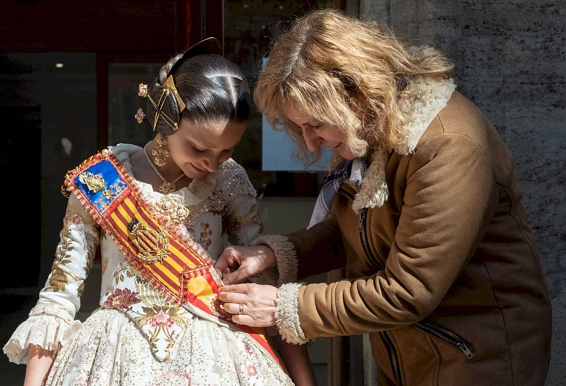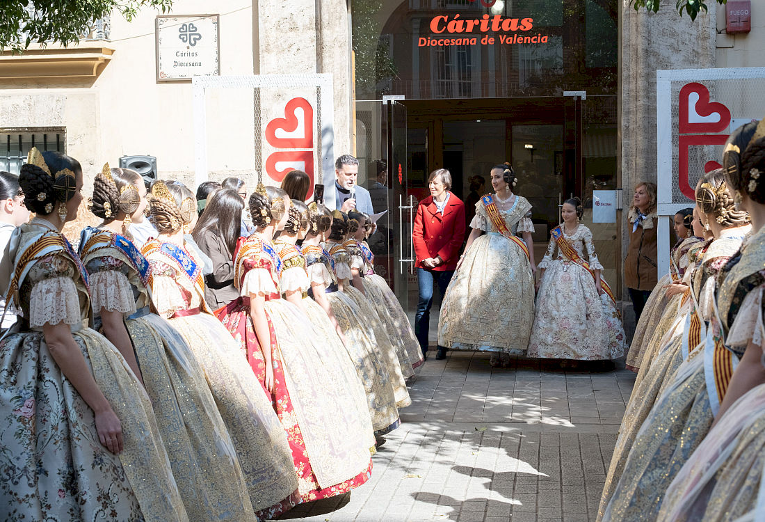 Las representantes de las fiestas josefinas han llegado a la sede de Cáritas Valencia a las 11.30 horas, donde han sido recibidas por su directora, Aurora Aranda, y una amplia representación de las personas voluntarias y participantes en los proyectos de la institución y sus Fundaciones.
