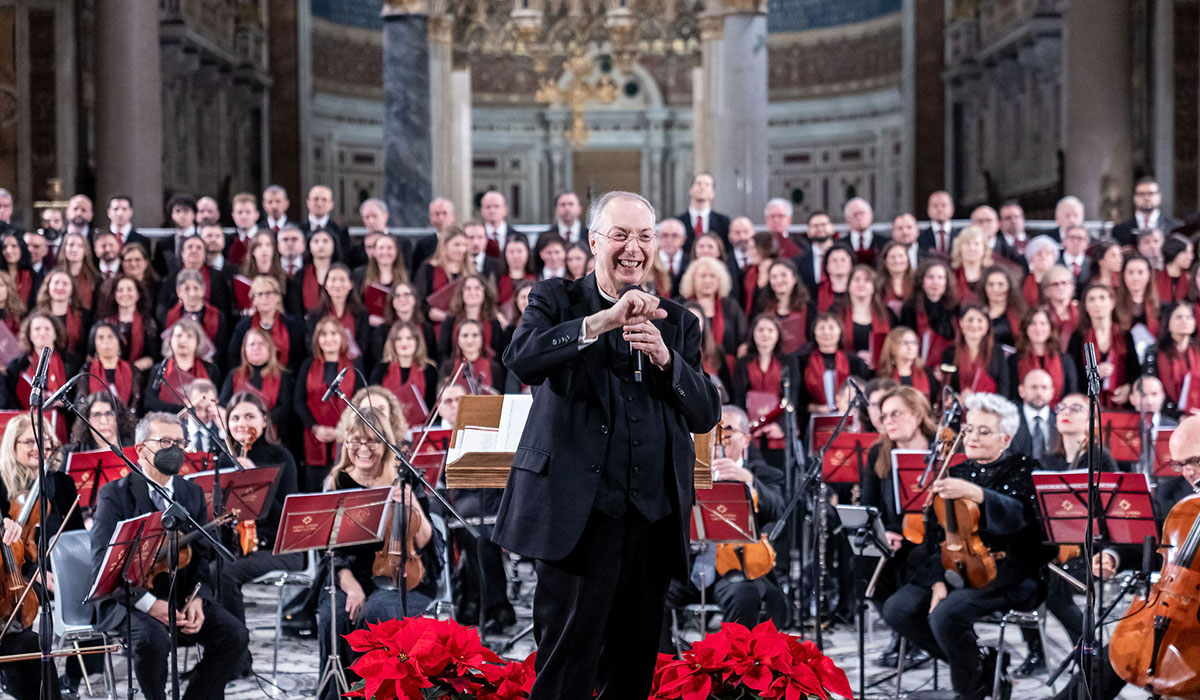 El concierto cuenta con un excepcional conjunto del Coro Diocesano de Roma, acompañado por la Orquesta Nova Opera: más de 200 cantantes y 50 directores, bajo la dirección del compositor Monseñor Marco Frisina