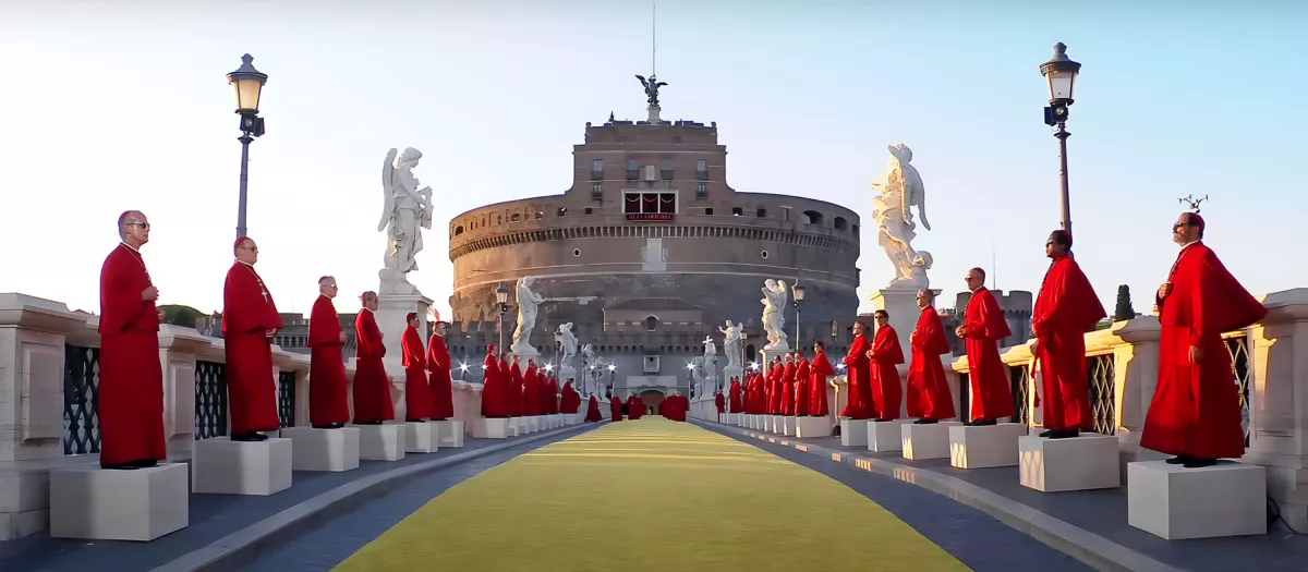 Es así como estos diseñadores italianos han centrado su propuesta en la estética litúrgica de la Iglesia católica, evocando una especie de procesión sobre el Puente Sant’Angelo con modelos vestidos como cardenales y el sonido de campanas de fondo.