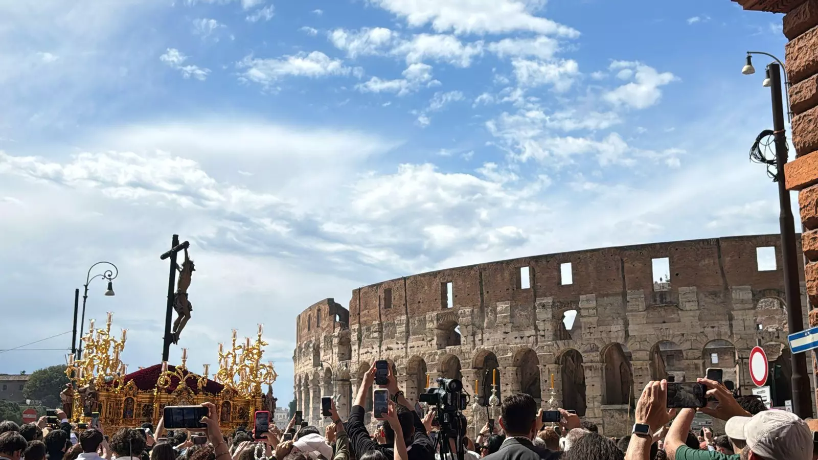 El Cristo de la Expiración ha alcanzado uno de los puntos más emblemáticos de su procesión en Roma: el Coliseo.