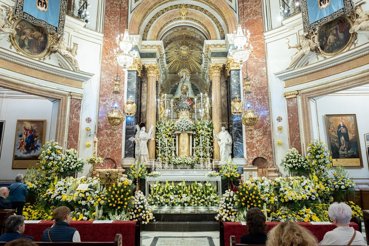 La tradicional “Festa dels Floristes” se celebra desde 1885 y con motivo de esta fiesta un grupo de representantes del gremio decoraron anoche el altar, las capillas, el presbiterio y el púlpito de la Basílica, para que esta mañana ya lucieran los ramos y arreglos florales donados por las propias floristerías y también por los floricultores.