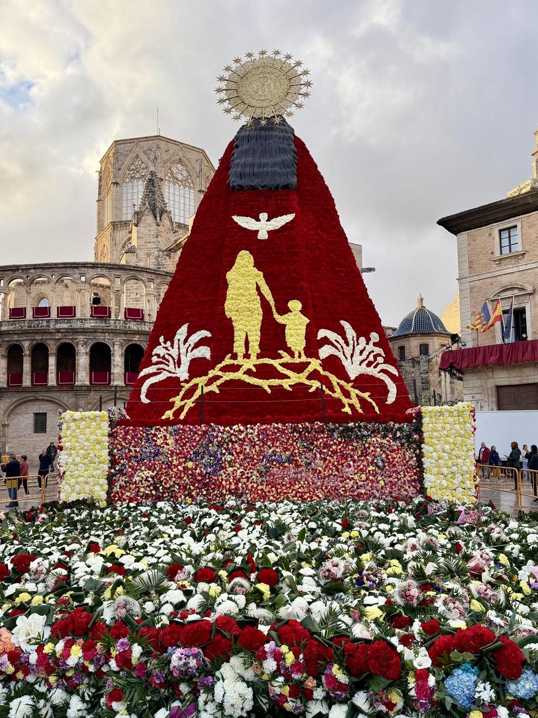 El diseño de este año, obra de la artista Xenia Magraner, no es solo una exhibición técnica, sino un mensaje visual cargado de simbolismo. El manto muestra las figuras de una madre y su hijo de la mano, representando la esperanza.