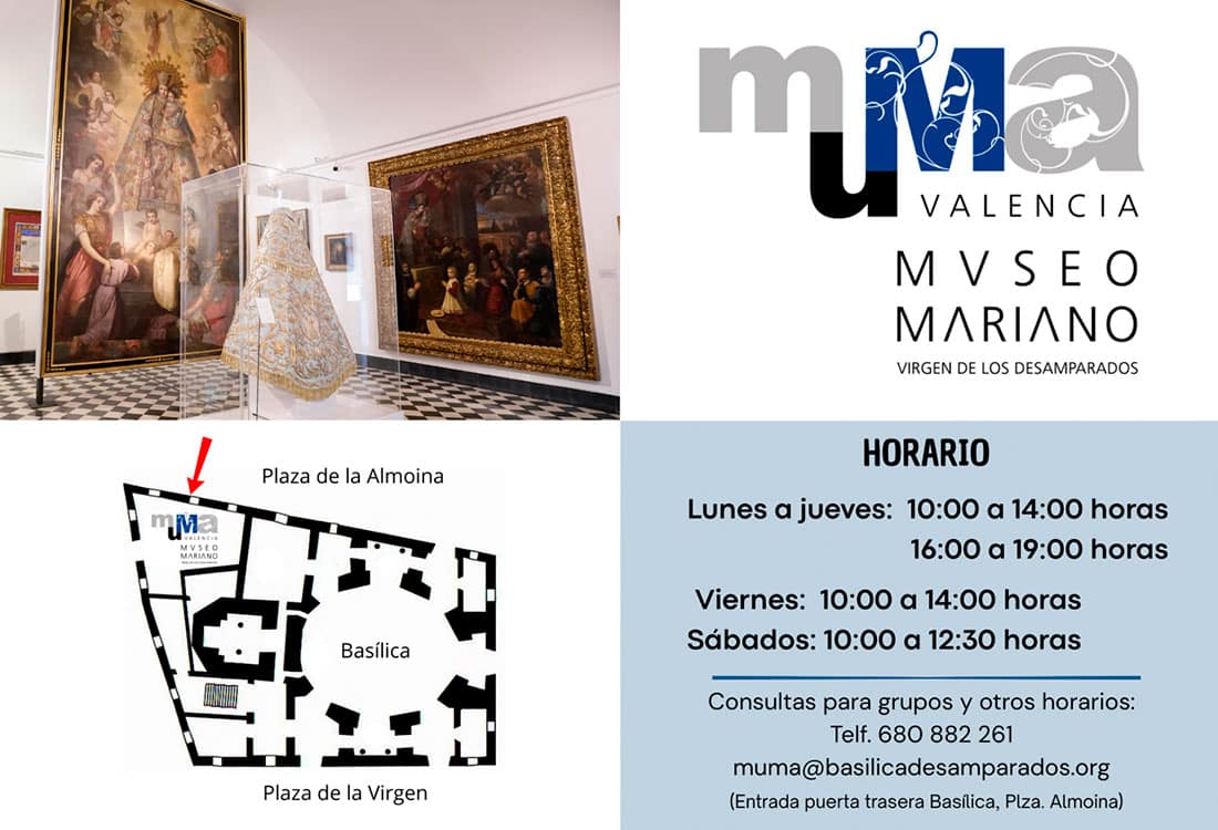 El MuMa, Museo Mariano de la Virgen de los Desamparados de la Real Basílica, amplía a un nuevo horario y días, dando así un mayor servicio a los visitantes, contemplando también la opción de visitas concertadas para grupos, y la posibilidad a otros horarios diferentes