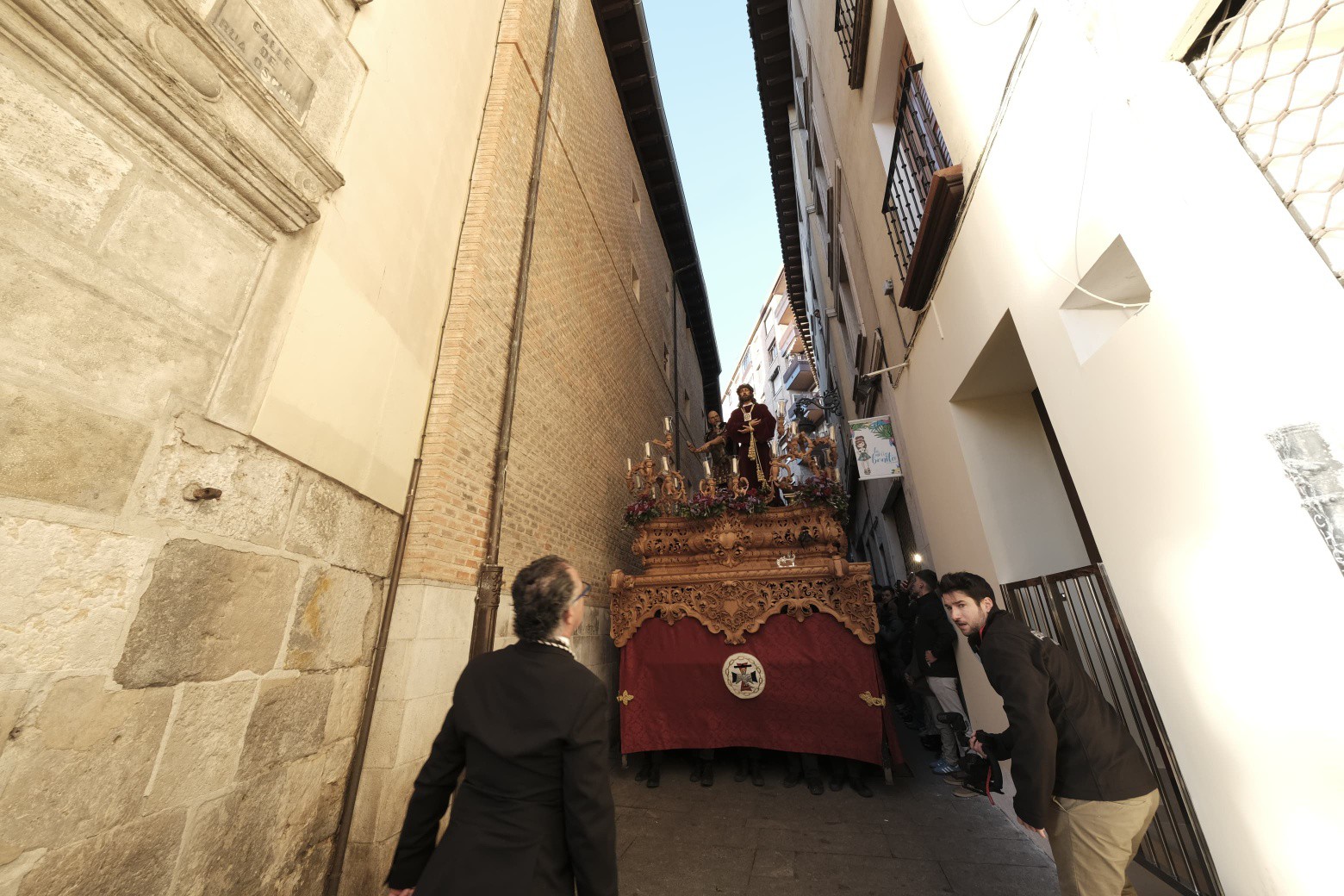 Emoción y fervor al paso de La Sentencia en la Procesión de Regla de la Hermandad del Santísimo Cristo Jesús de Medinaceli, que, tras salvar la estrechez de la calle Rúa Oscura, vivió uno de sus momentos más emotivos en Platerías, cantándole a la Virgen de la Cofradía Penitencial de la Santa Vera Cruz.