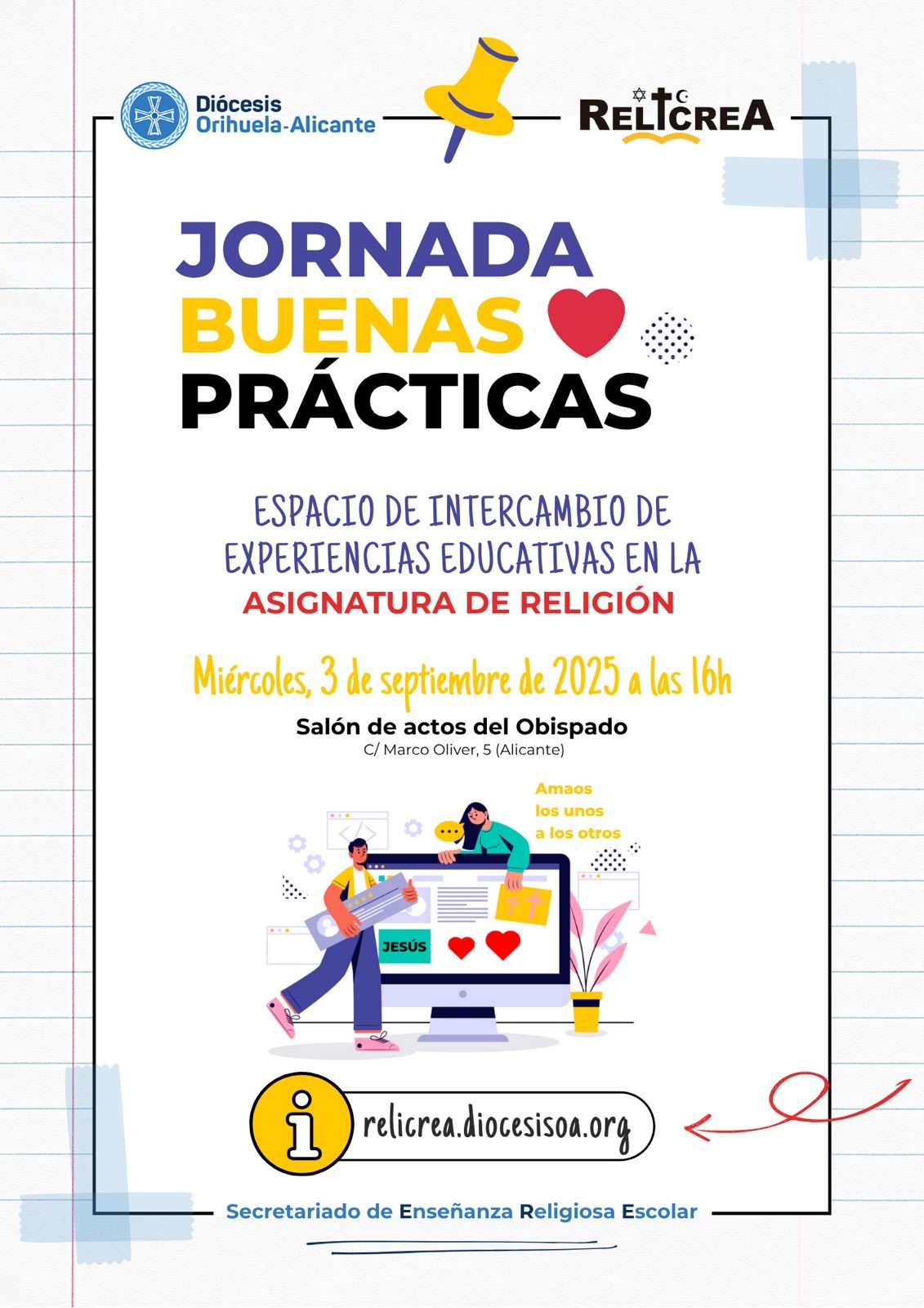 Desde el Secretariado de Enseñanza Religiosa Escolar de la Delegación para la educación y la cultura se ha organizado la I Jornada de buenas prácticas (espacio de intercambio de experiencias educativas en la asignatura de religión) que tendrá lugar el próximo miércoles, 3 de septiembre de 2025 a las 16h en el Salón de actos del Obispado de Orihuela-Alicante