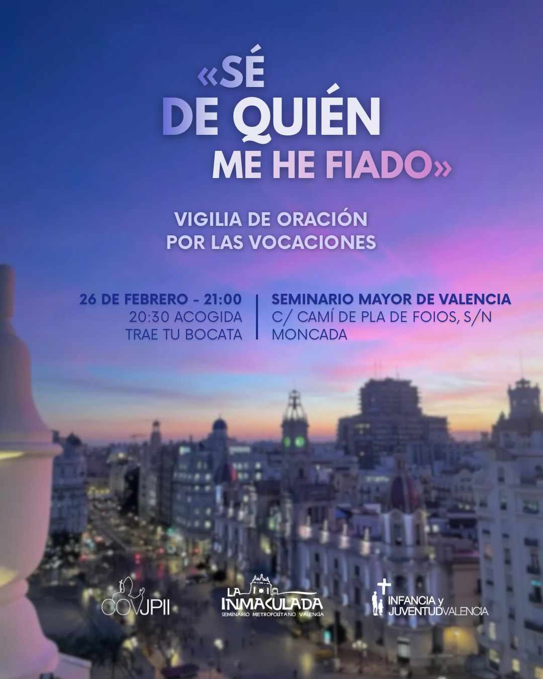El Seminario Mayor de Moncada acogerá este jueves, 26 de febrero, una Vigilia de Oración por las Vocaciones. Dará comienzo a las nueve de la noche, aunque las puertas del Seminario abrirán a las ocho y media de la tarde para acoger a los participantes, entre ellos muchos jóvenes que compartirán también la cena y momentos de adoración, oración, testimonios y música.