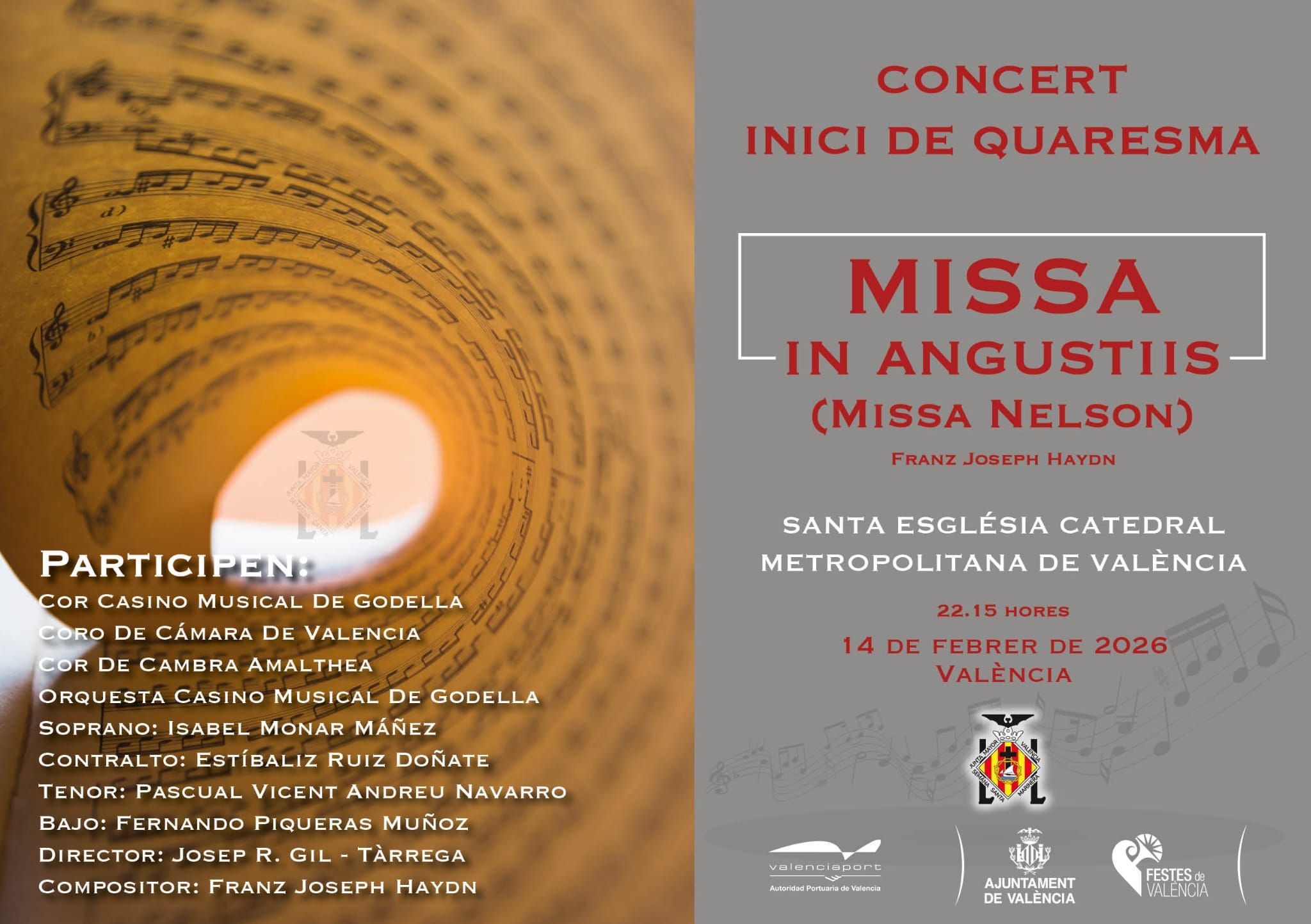 En esta ocasión será con la Misa in Angustiis o Misa Nelson, de Joseph Haydn (1732-1809), bajo la batuta del maestro Jose Ramon Gil-Tàrrega, junto con la Orquesta y el Coro del Casino Musical de Godella,, el Coro de Cámara de Valencia y el Cor de Cambra Amalthea.