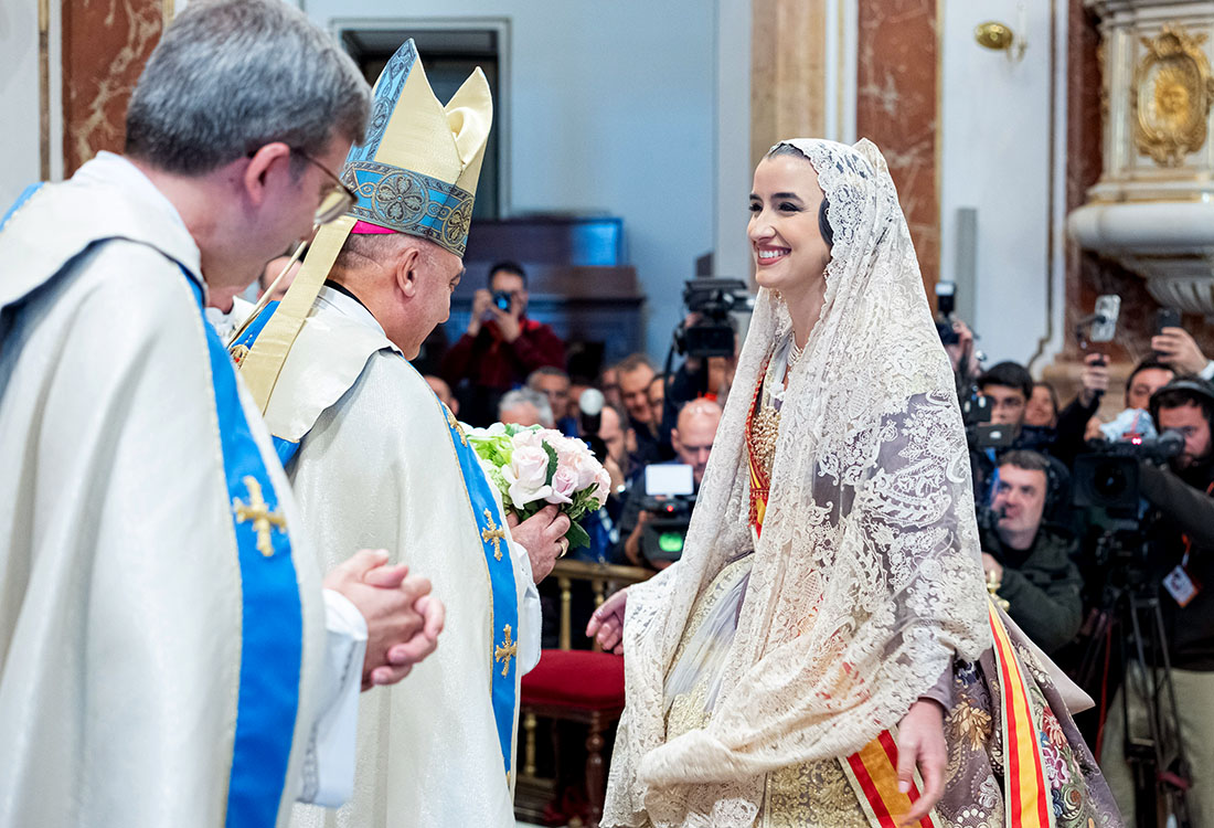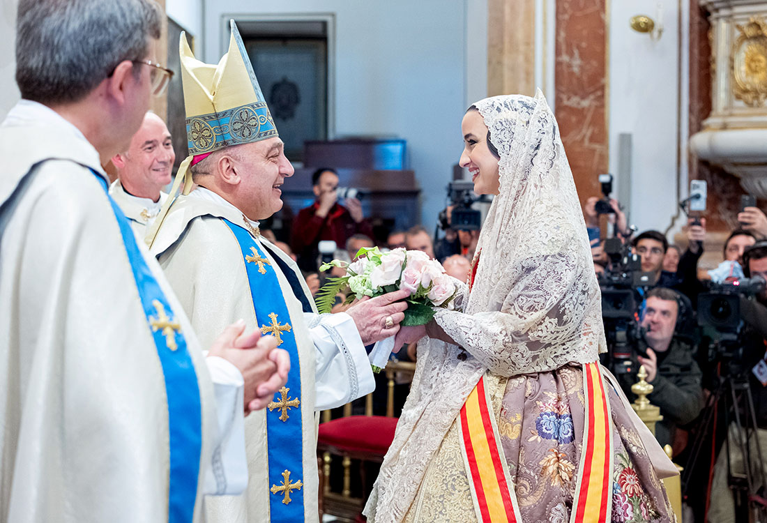 La Fallera Mayor de Valencia, recibida por el Arzobispo en la Basílica de la Virgen tras finalizar la Ofrenda