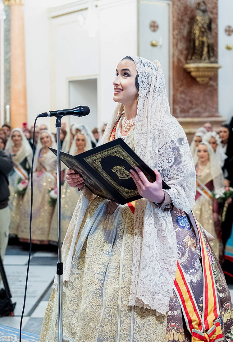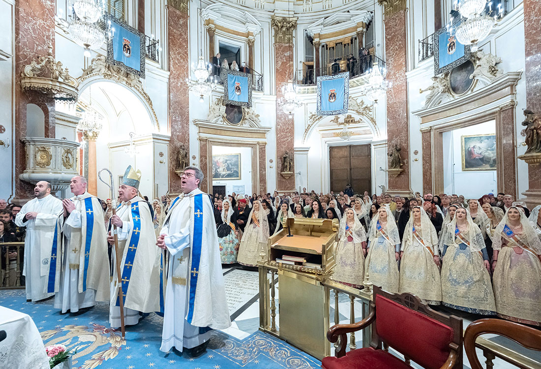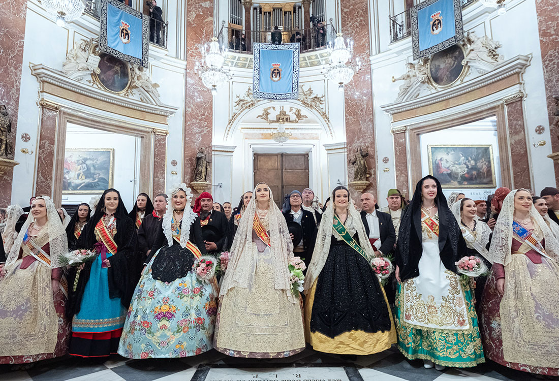Una vez en la Basílica, la Fallera Mayor y todas las falleras de su Corte realizaron la ofrenda de su ramo ante la imagen de la Mare de Déu que preside el altar en un acto presidido por el Arzobispo, en el que también estuvieron presentes el rector y el vicerrector, Melchor Seguí y Álvaro Almenar, respectivamente.