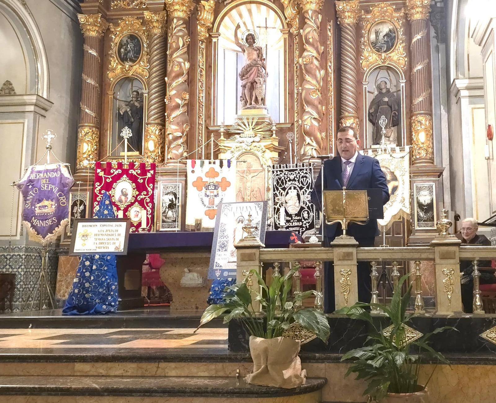 El acto también sirvió para poner en valor el trabajo de las instituciones que sostienen la tradición. Uno de los momentos más significativos de la tarde fue la entrega de la Distinción Especial para la Junta Diocesana. El galardón fue recogido por Don Salvador Navarro Sanchís, presidente de la entidad, quien agradeció el compromiso de la comunidad manisera con la fe diocesana.