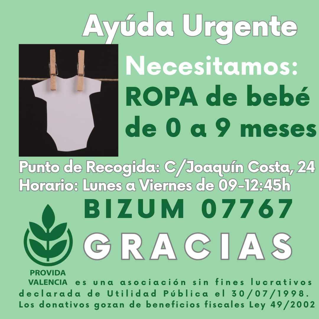 La Asociación para la Defensa de la Vida Provida Valencia ha realizado un llamamiento de ayuda ante la necesidad de ropa de bebé de 0 a 9 meses para las mujeres y madres que atiende, en su sede en la calle Joaquín Costa, 24.