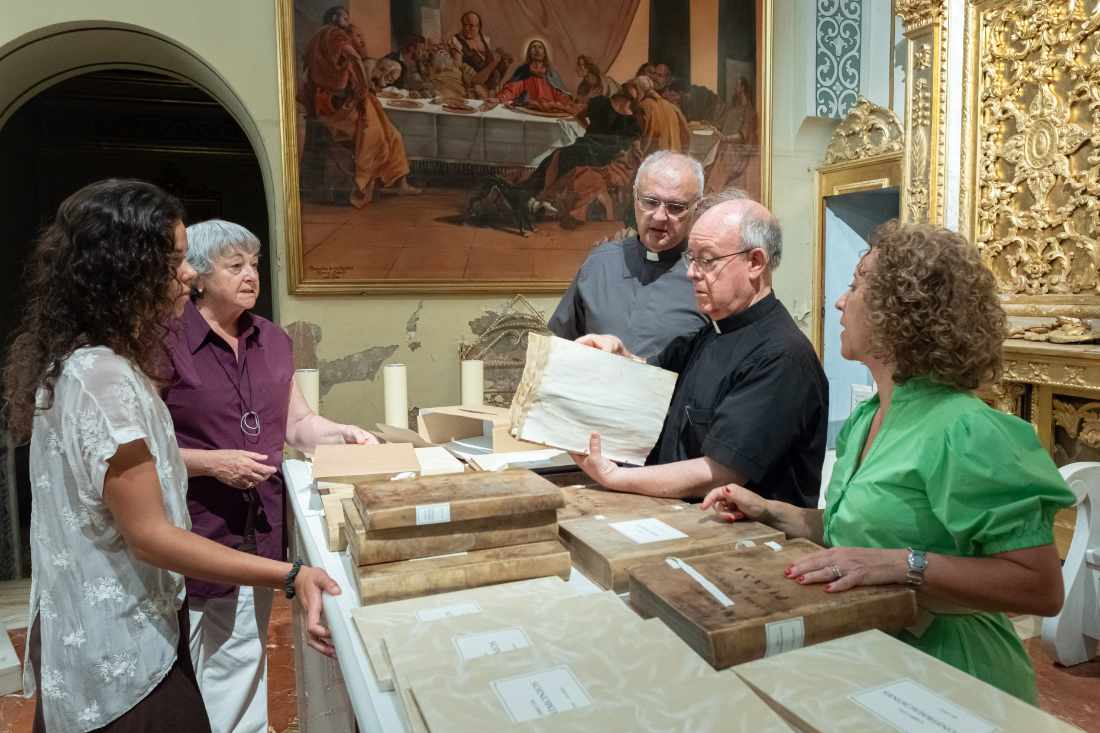El Delegado de Patrimonio, Vicente Pons, junto al párroco de Picanya, la Directora del IVCR+i, Gemma Contreras, y representantes de «Dosdetres», en la entrega de los libros sacramentales