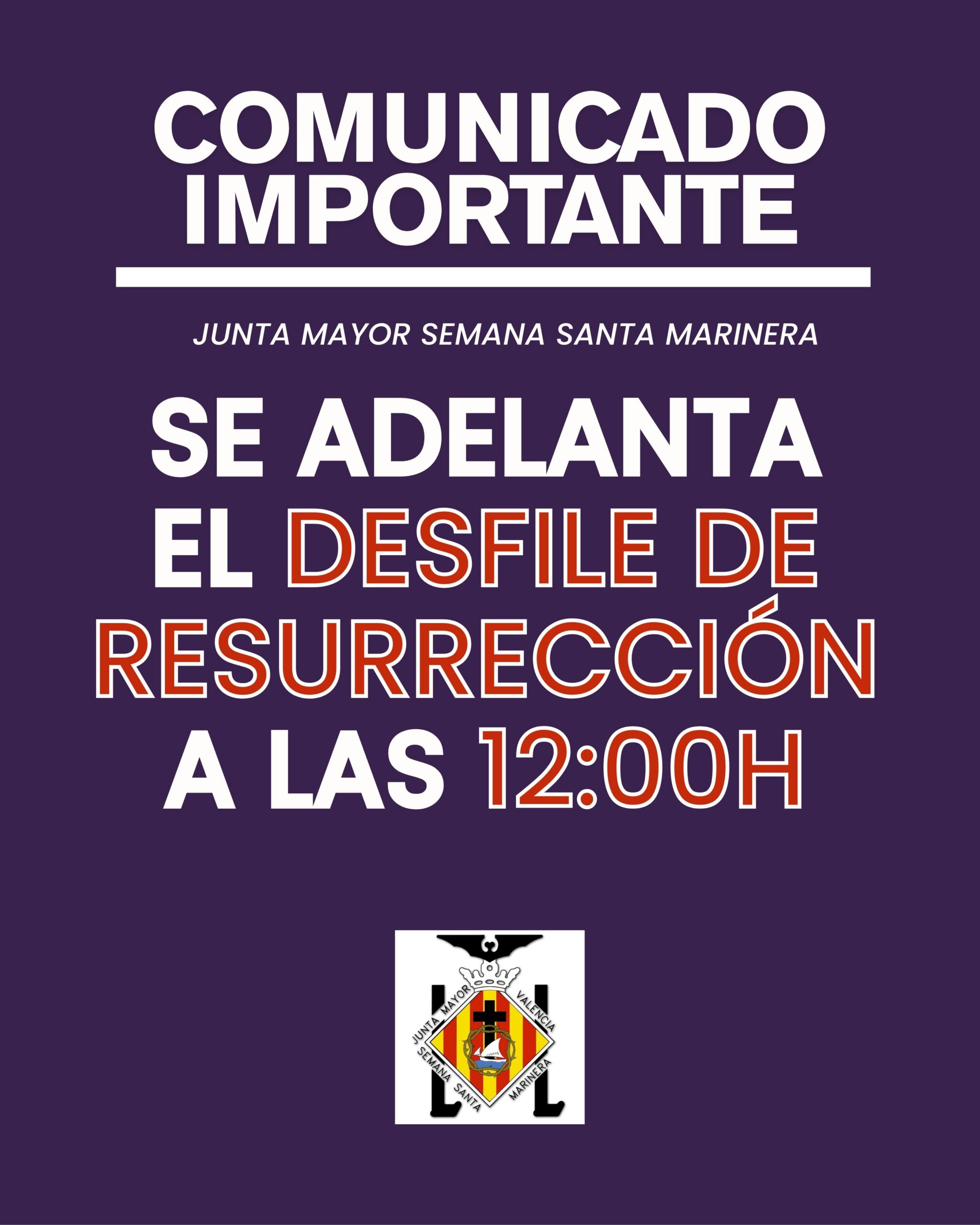 En reunión extraordinaria de Presidentes y Hermanos Mayores, se ha decidido adelantar el inicio del Desfile de Resurrección a las 12:00 horas debido a la previsión meteorológica desfavorable.