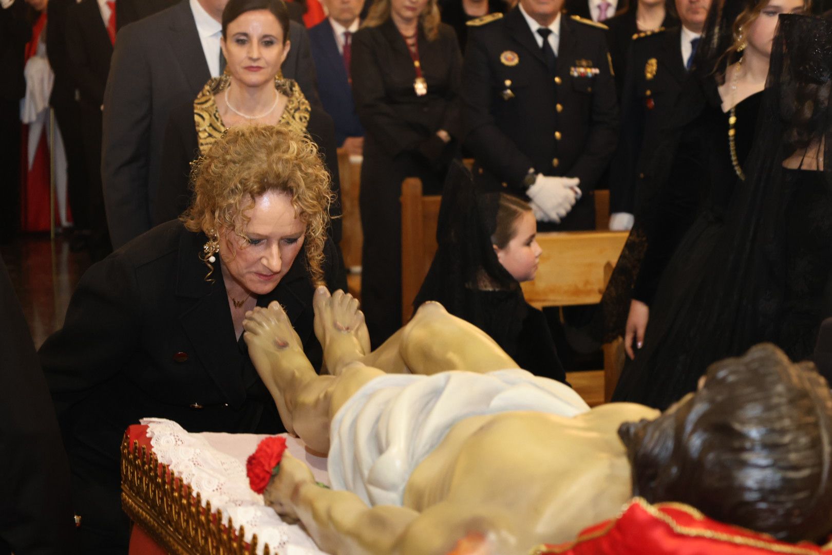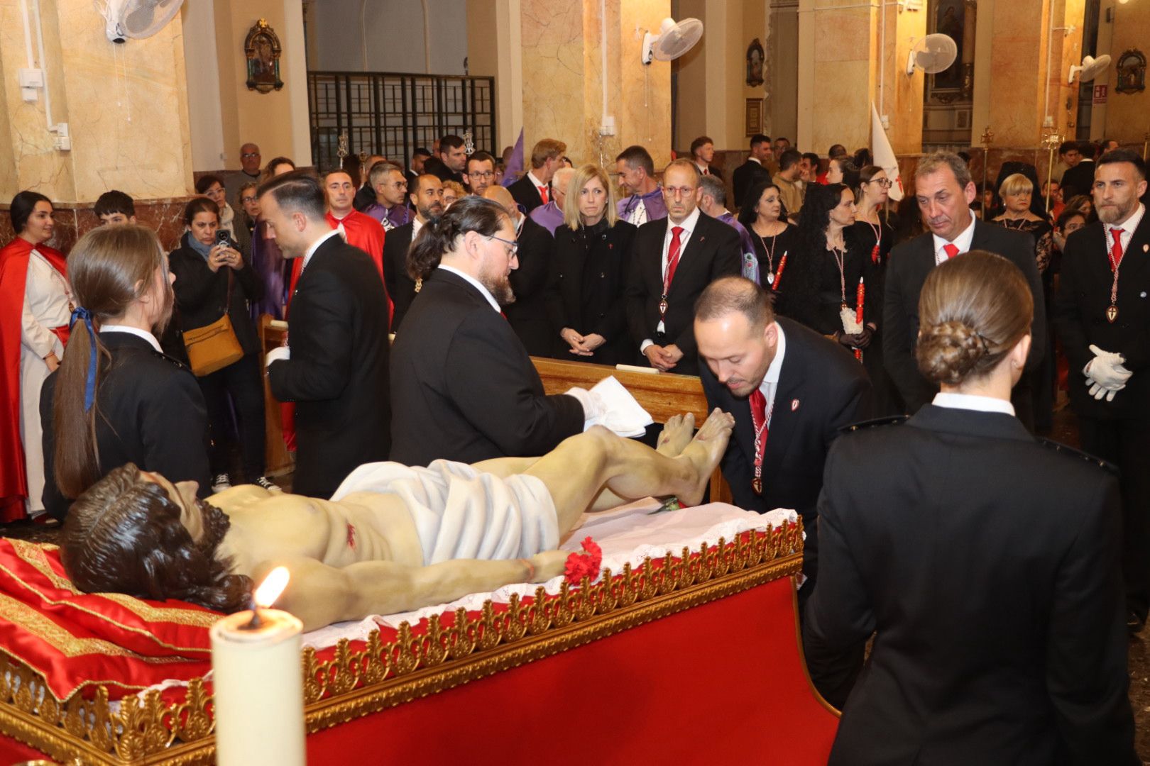 Una vez finalizada la procesión, las imágenes del Cristo Yacente de la Hermandad del Santo Sepulcro y de Nuestra Señora de los Dolores entraron en la Parroquia de Monte-Sión para celebrar un emotivo acto de adoración al Cristo Yacente. Este momento de recogimiento y oración contó con la participación de un gran número de fieles, quienes vivieron una de las escenas más conmovedoras de la Semana Santa.