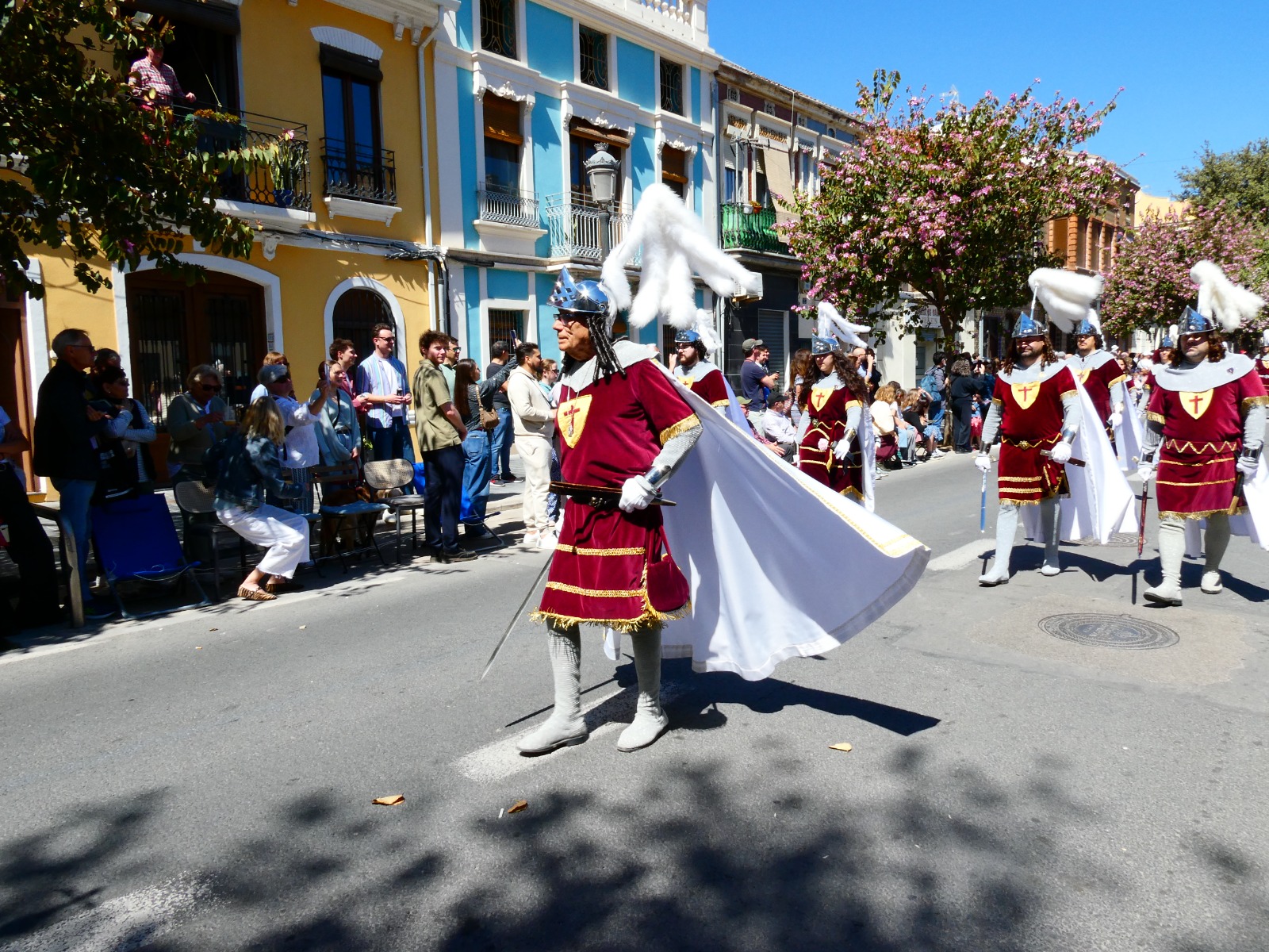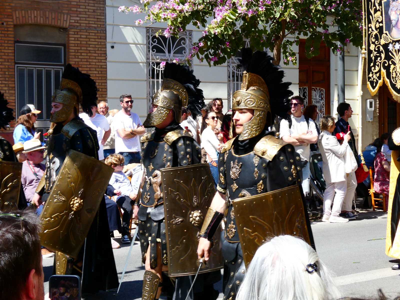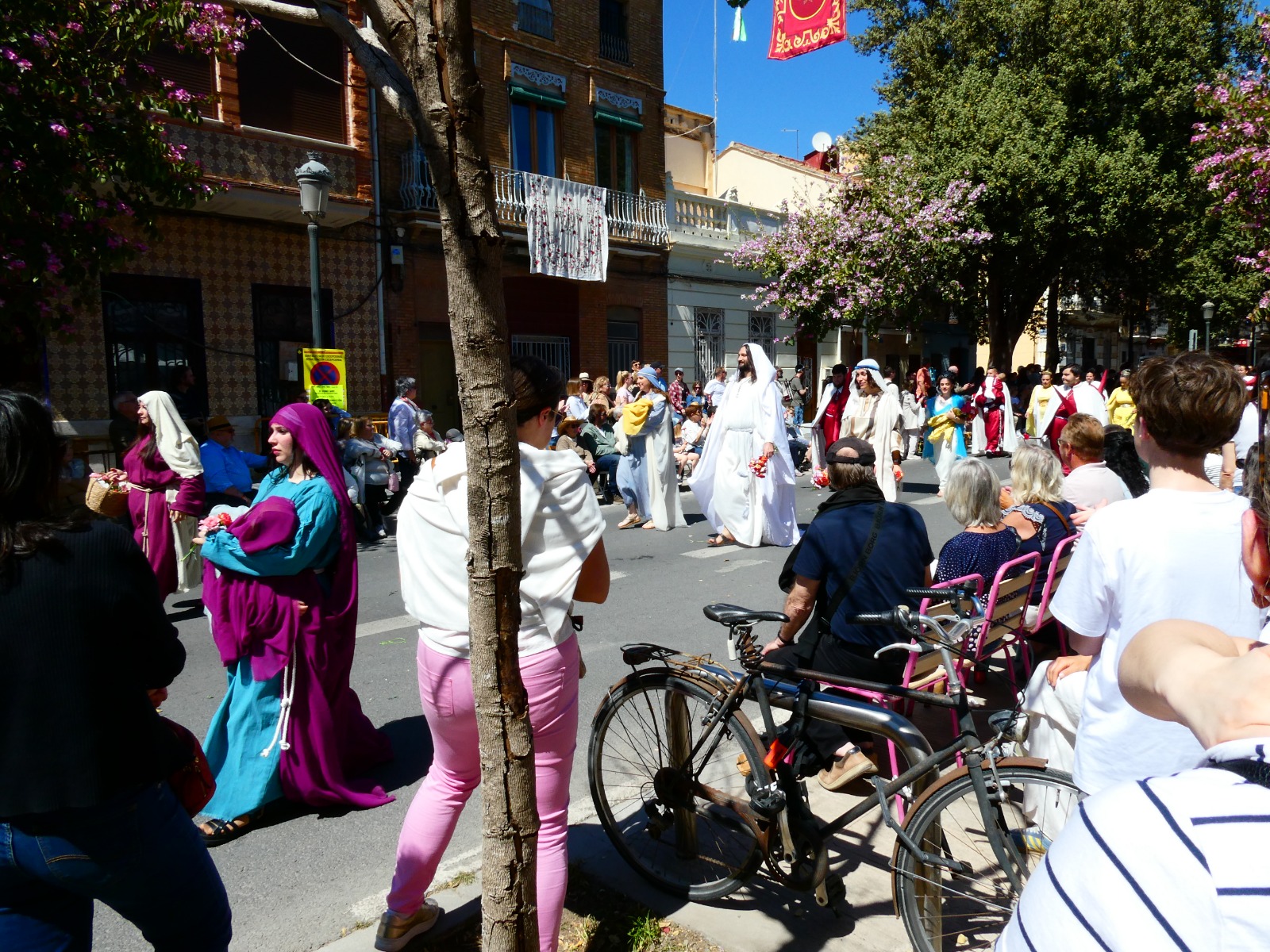 Los pesados cirios fueron sustituidos por ramos de claveles blancos y rojos. Personajes bíblicos como la Reina Ester o las Tres Marías, ahora sin velos de tristeza, repartieron flores entre una multitud que abarrotaba la Avenida del Mediterráneo.