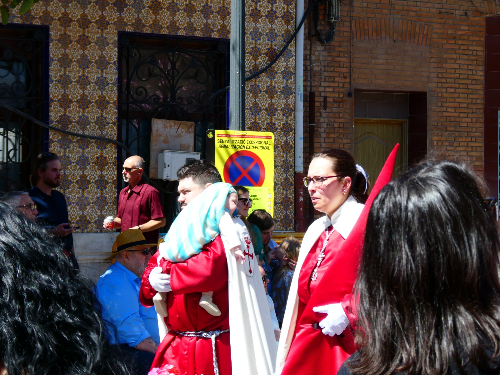 A las 13:00 horas, la fisonomía del barrio cambió por completo. Las túnicas oscuras y los capirotes que ocultaban los rostros en las procesiones de dolor quedaron guardados. En el Desfile de Resurrección, los protagonistas son los cofrades, quienes desfilan a rostro descubierto y con la sonrisa recuperada.